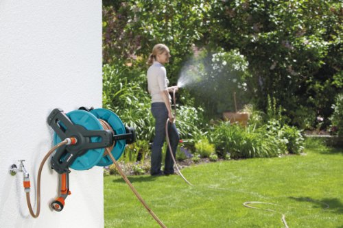 Wall-Fixed Hose Reel 50 Set Plastic, assembled, 20m Classic hose 13mm (1/2″), Set (1x 18202/5305, 3x 18215, 1x 18213, 1x 18300; reel capacity: max. 50m 13mm (1/2″) hose, 40m 15mm (5/8″) hose, 25m 19mm (3/4″) hose